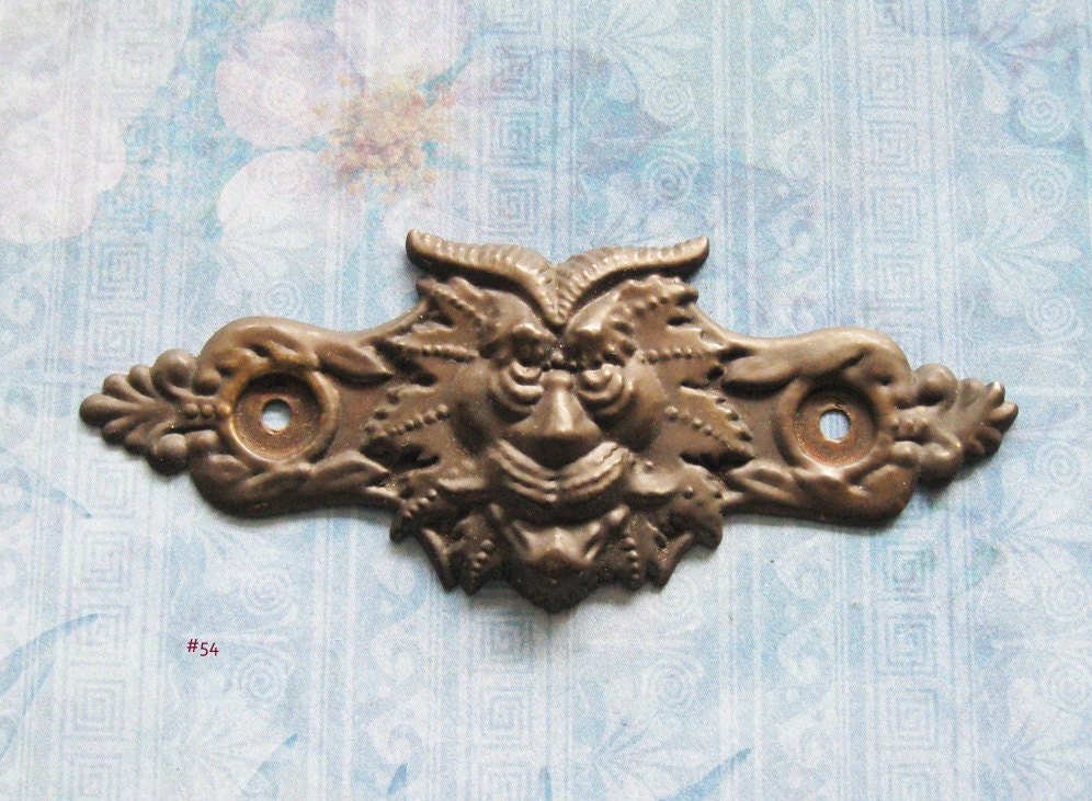 Horned Gargoyle Escutcheon Antique Brass Figural Face Victorian German Hardware Furniture Pull Plate from Foundlings